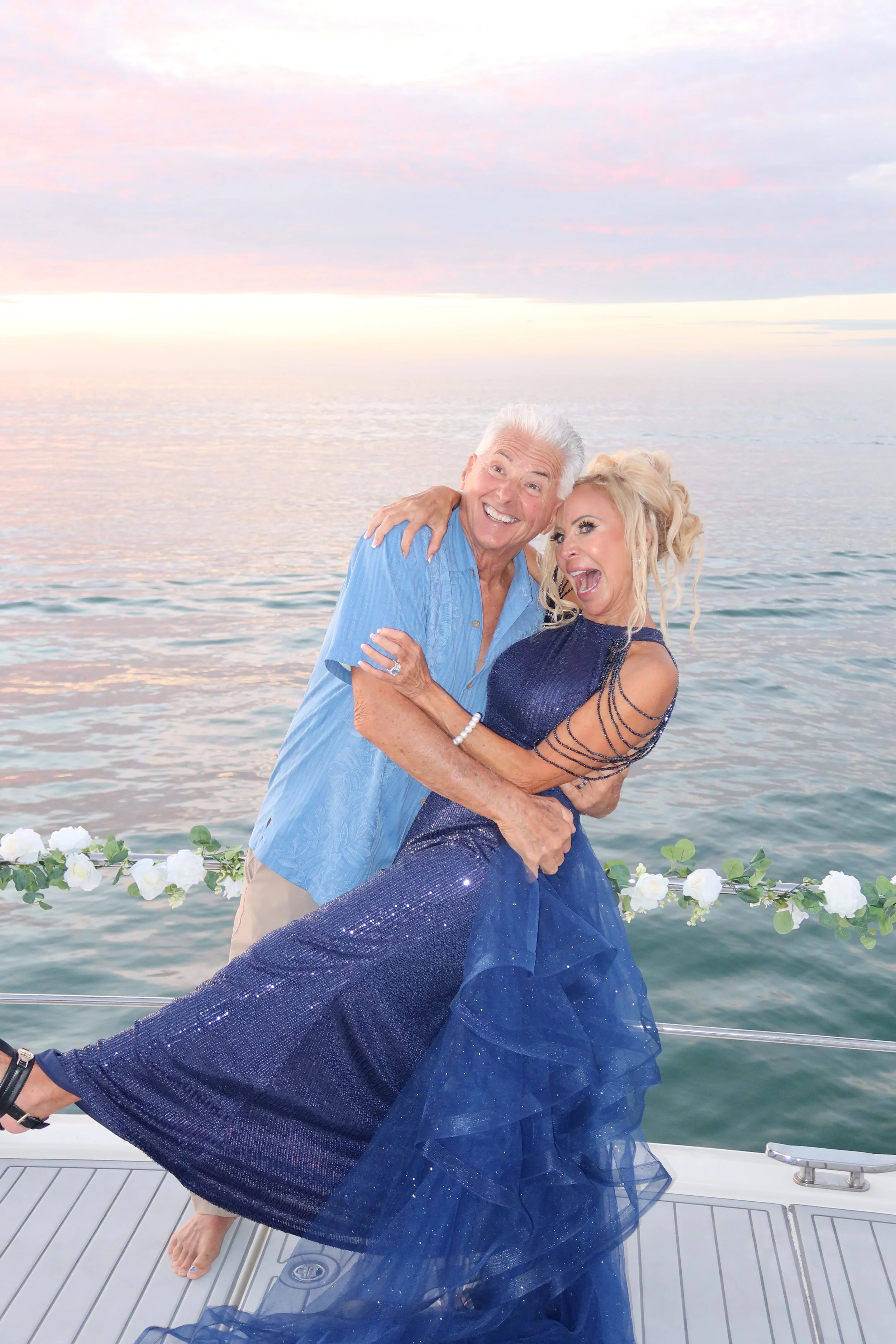 After exchanging vows, everyone continued dancing on deck. Karen changed into a navy blue dress for the reception portion of the cruise, giving the night one more memorable touch. The celebration wrapped with a relaxed dinner at Ocean Prime, where the group toasted to the newlyweds and the perfect Sarasota evening.
